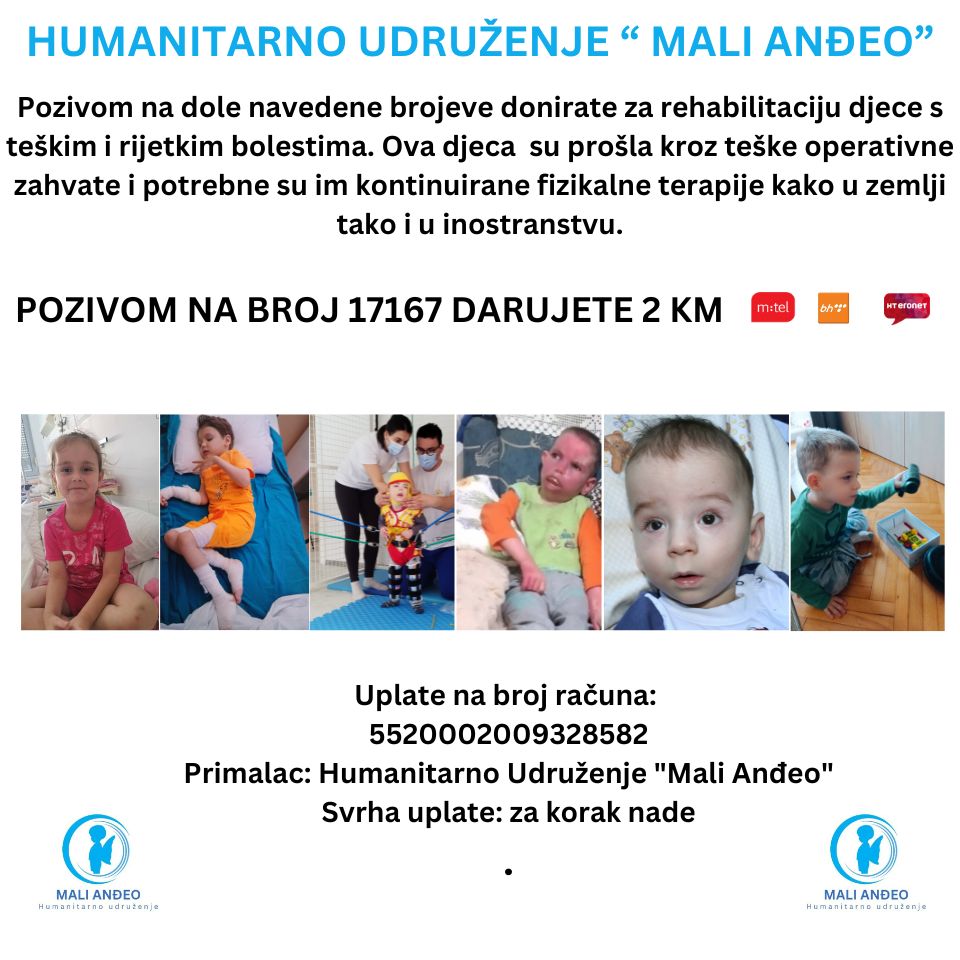 Humanitarno udruženje „Mali Anđeo“ pokrenulo je novu humanitarnu akciju s ciljem prikupljanja sredstava za djecu koja vode najteže bitke – borbu sa rijetkim i teškim bolestima koje zahtijevaju dugotrajne, zahtjevne i izuzetno skupe rehabilitacije. Riječ je o mališanima koji su, uprkos svom uzrastu, već prošli kroz brojne operativne zahvate, iscrpljujuće terapije i dugotrajna liječenja, a mnogi od njih su priliku za ozdravljenje potražili i u inostranstvu, zahvaljujući Fondu za liječenje djece u inostranstvu „Duša djece“. Iako se dio rehabilitacija obavlja u našoj zemlji, nerijetko su potrebni i odlasci u specijalizovane centre van granica BiH, što dodatno povećava finansijski pritisak na porodice koje se svakodnevno bore da svojoj djeci obezbijede šansu za normalno i bezbrižno djetinjstvo. Svjesni koliko su ti koraci teški, ali i koliko znače, iz udruženja „Mali Anđeo“ osnovali su fond za rehabilitaciju simboličnog naziva „Korak nade“.
