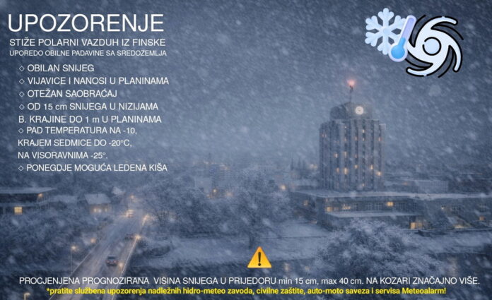 U nedjelju 04.01. očekuju se jače snježne padavine uz brzo formiranje i porast snježnog pokrivača. Do ponedjeljka ujutru očekuje se od 10 do 30 cm snijega, na krajnjem sjeverozapadu i jugoistoku manji snježni pokrivač a u brdsko-planinskim predjelima očekuje se do 50 cm snijega. U brdsko-planinskim predjelima će duvati jak vjetar koji će stvarati snježne nanose i vijavice. U ponjedeljak će padavine biti slabije uz manji porast snježnog pokrivača a nove jače padavine se očekuju u utorak 06.01.2026.
