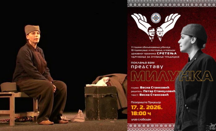 U duhu obilježavanja velikog jubileja – deset godina rada i očuvanja tradicije – Udruženje za očuvanje tradicije priređuje poseban kulturni događaj povodom državnog praznika Sretenja. Publika u Prijedoru imaće priliku da sutra, 17. februara 2026. godine, u sali Pozorište Prijedor, prisustvuje izvođenju snažne monodrame „Milunka“, sa početkom u 18 časova. Ulaz na predstavu je slobodan.