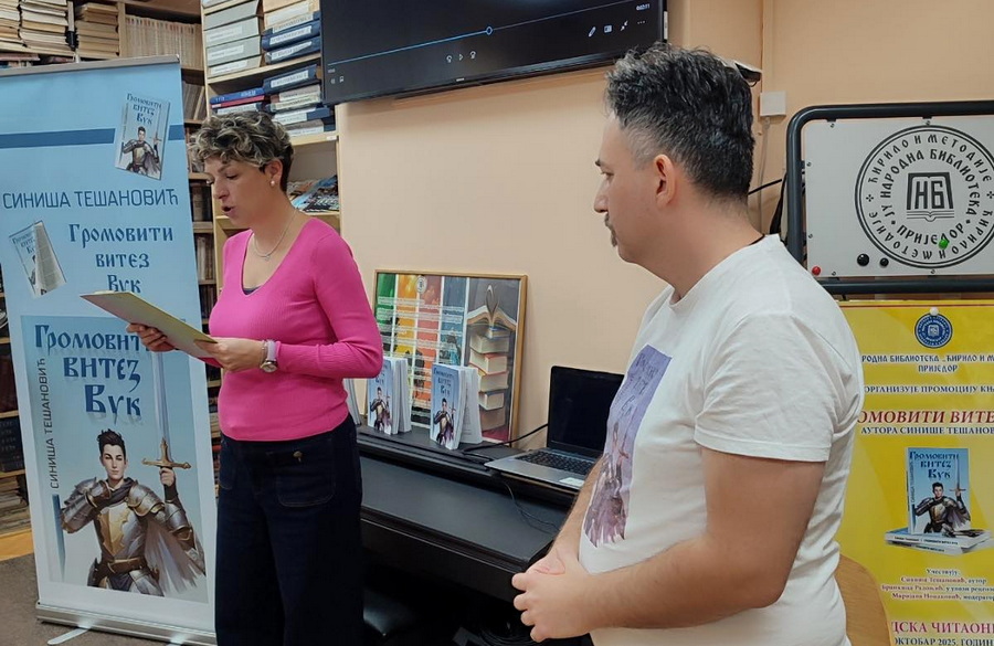 U toploj atmosferi Gradske čitaonice Narodne biblioteke „Ćirilo i Metodije“, juče je povodom Nedjelje djeteta održana promocija romana „Gromoviti vitez Vuk“ prnjavorskog pisca, glumca i dramaturga Siniše Tešanovića. Knjiga je namijenjena djeci i mladima, a publiku su činili učenici petih razreda Osnovne škole „Petar Kočić“ iz Prijedora, njihovi učitelji i građani.