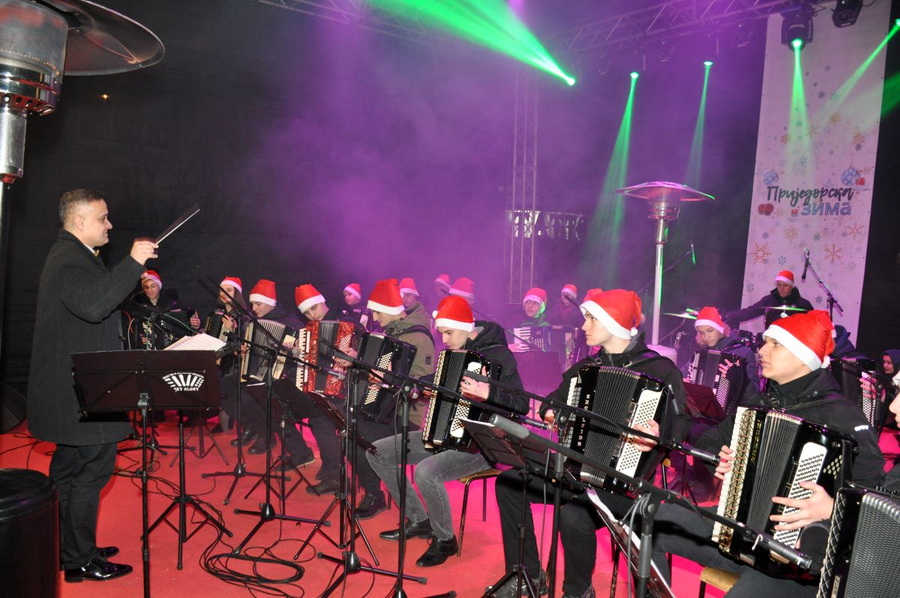 Na bini “Zimskog grada” u Prijedoru sinoć je nastupio Orkestar harmonika “Sky Glory”, predvođen umjetničkim rukovodiocem Milošem Zecom. Izveli su raznovrsan repertoar kome su dali prepoznatljiv pečat, kombinujući na instrumentu koji se tradicionalno povezuje s narodnom muzikom, moderne pop žanrove.