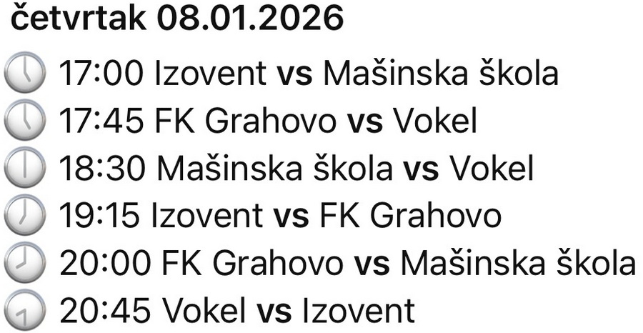 Novogodišnji turnir u malom fudbalu Prijedor 2026. Večeras, od 17,00 časova, je prva utakmicama seniora grupe C.
