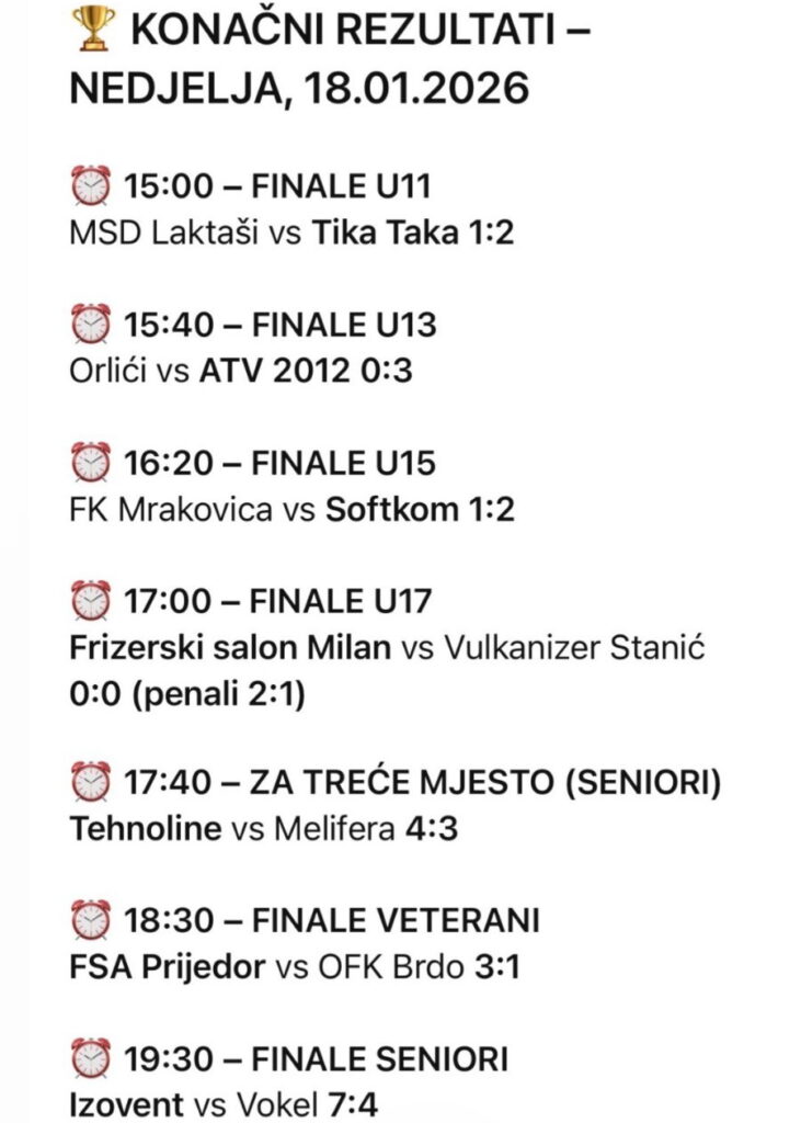 Trijumfom seniora ekipe Izovent iz Banjaluke i veterana FSA Prijedor završio je Novogodišnji turnir u malom fudbalu “Prijedor 2026”. Na turniru učestvovali je blizu 80 ekipa: 32 tima seniora, 40-ak mlađih kategorija, 6 veteranskih ekipa. Finalno veče je pratilo između 1.100 – 1.500 gledalaca.